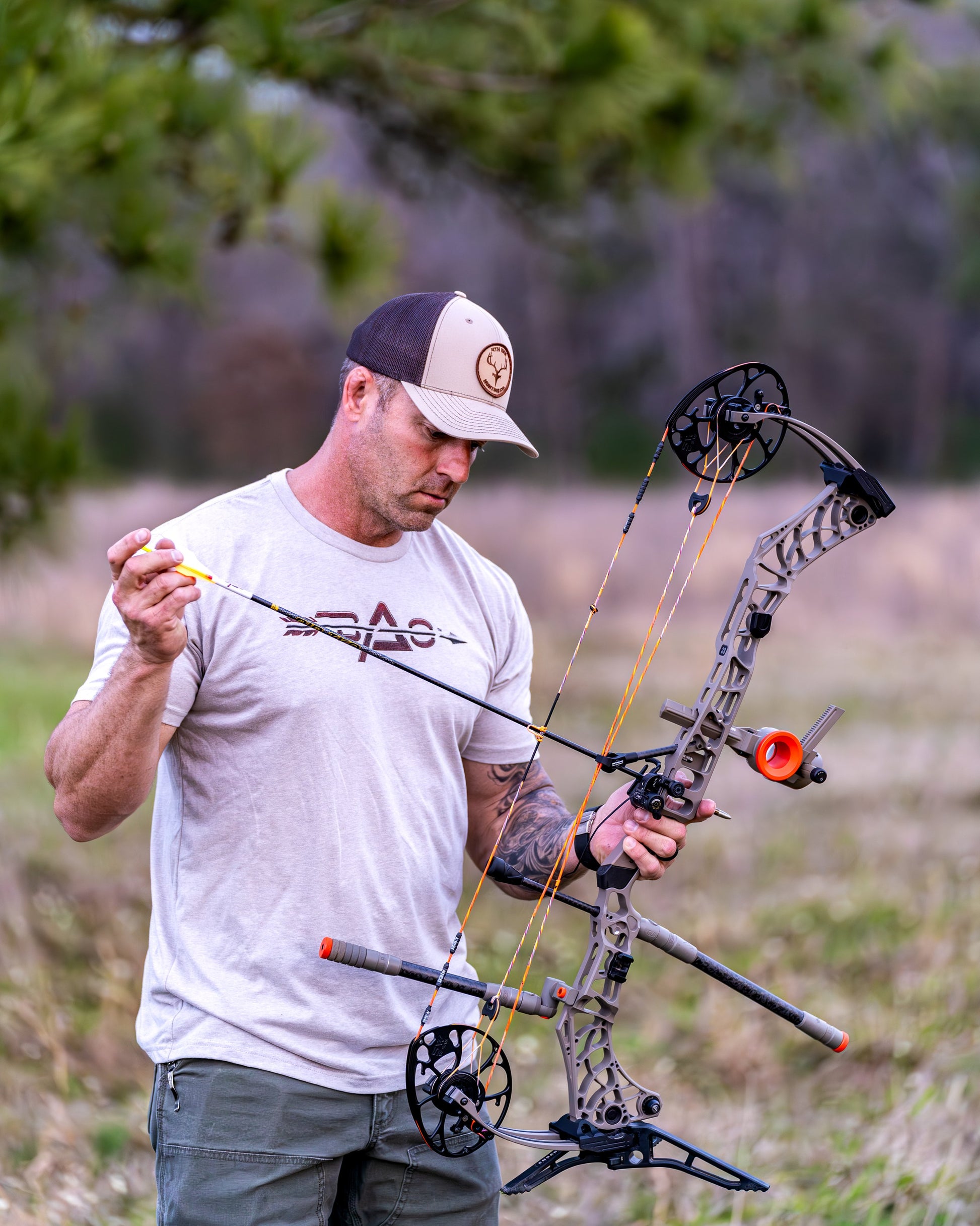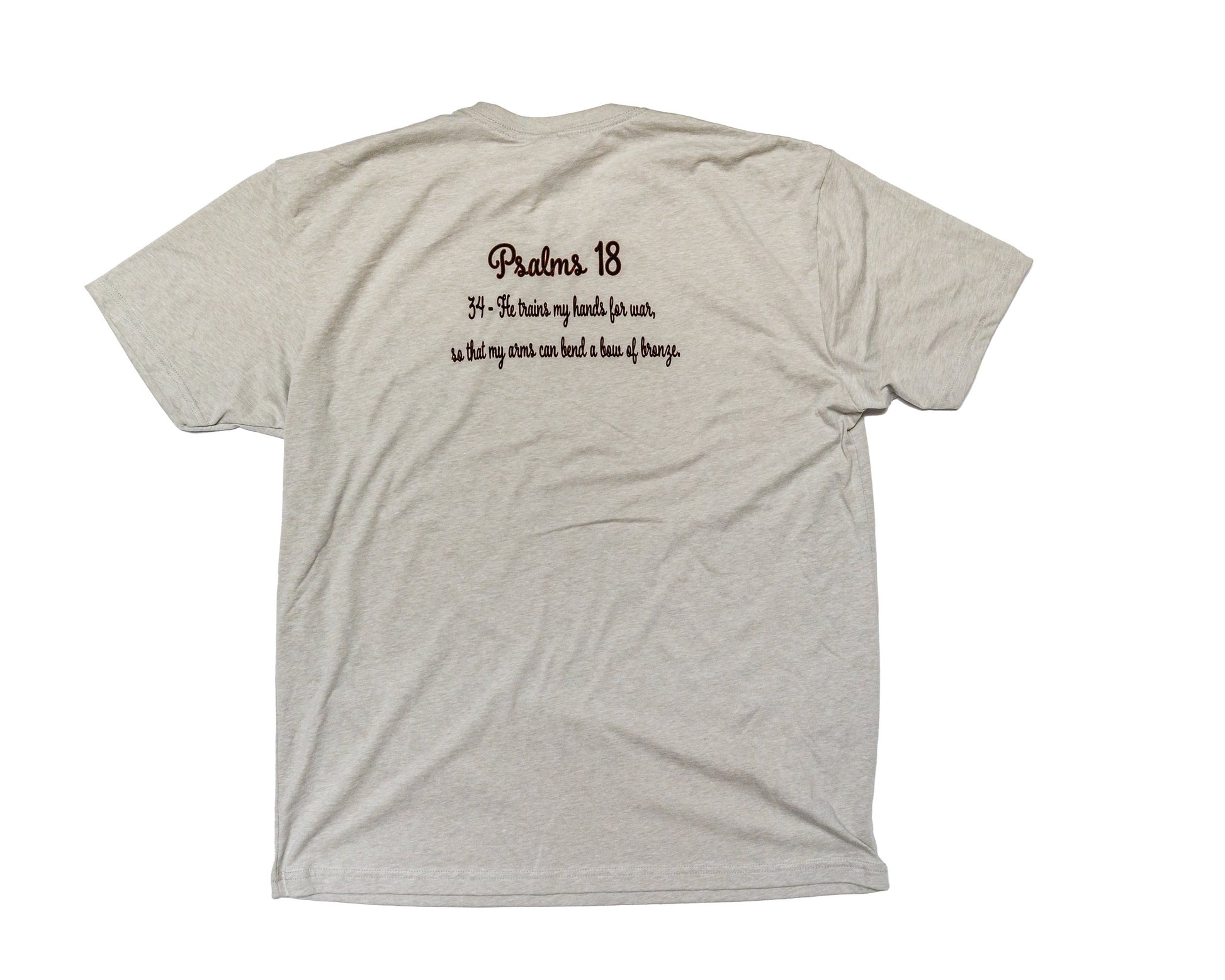 BAO silk grey t-shirt with Psalms 18:34 "He trains my hands for war, so that my arms can bend a bow of bronze."
